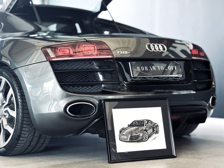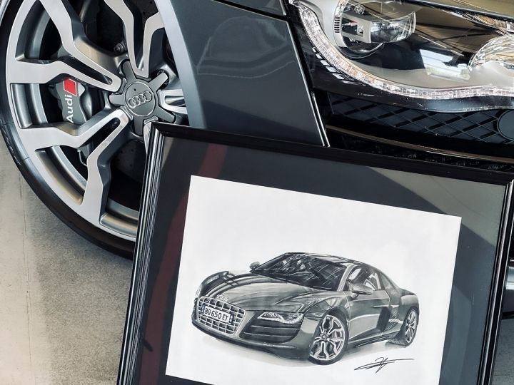 À l’occasion de l’acquisition de sa nouvelle Audi R8 V10 auprès de BHCAR Lyon Anse, le client a souhaité compléter cette expérience en commandant une illustration sur mesure de son véhicule.