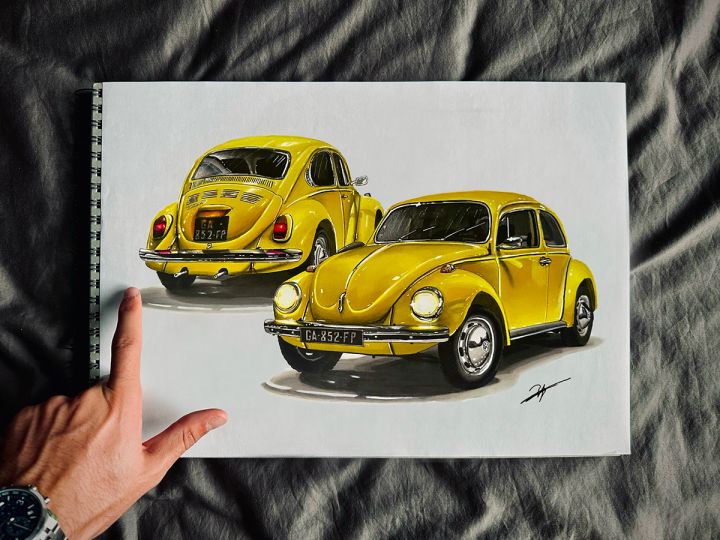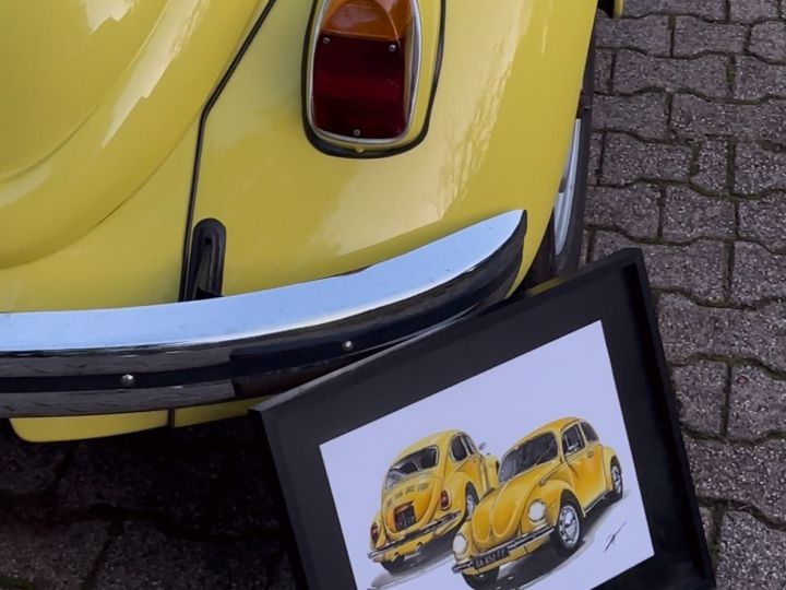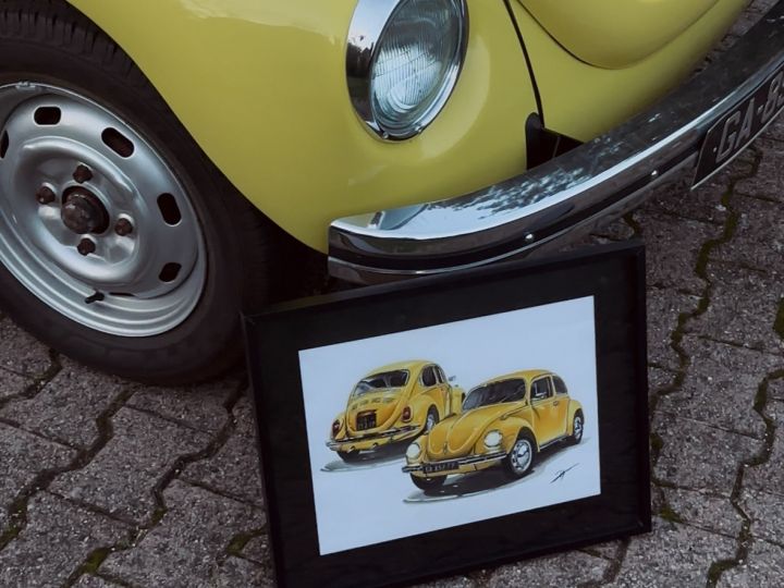 Tableau sur mesure, réalisé à la demande d’un particulier, illustrant sa Volkswagen Coccinelle 1302 de 1971.