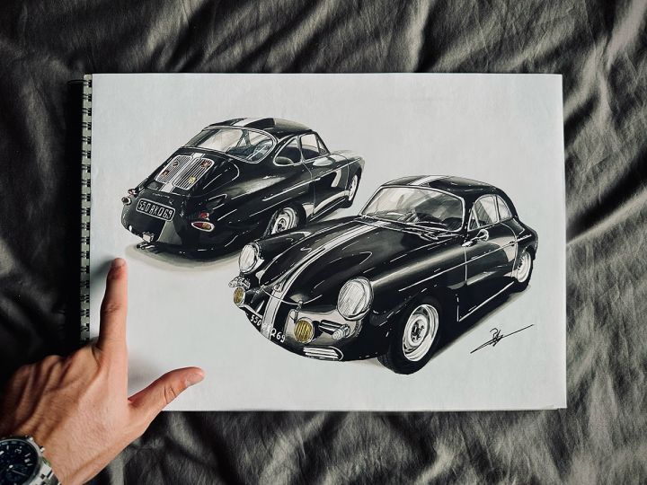 Tableau sur mesure réalisé pour le garage L’Adresse Auto 69, représentant leur Porsche 356 SC. Œuvre exposée lors du salon Époque Auto Lyon, les 6, 7 et 8 novembre 2025.